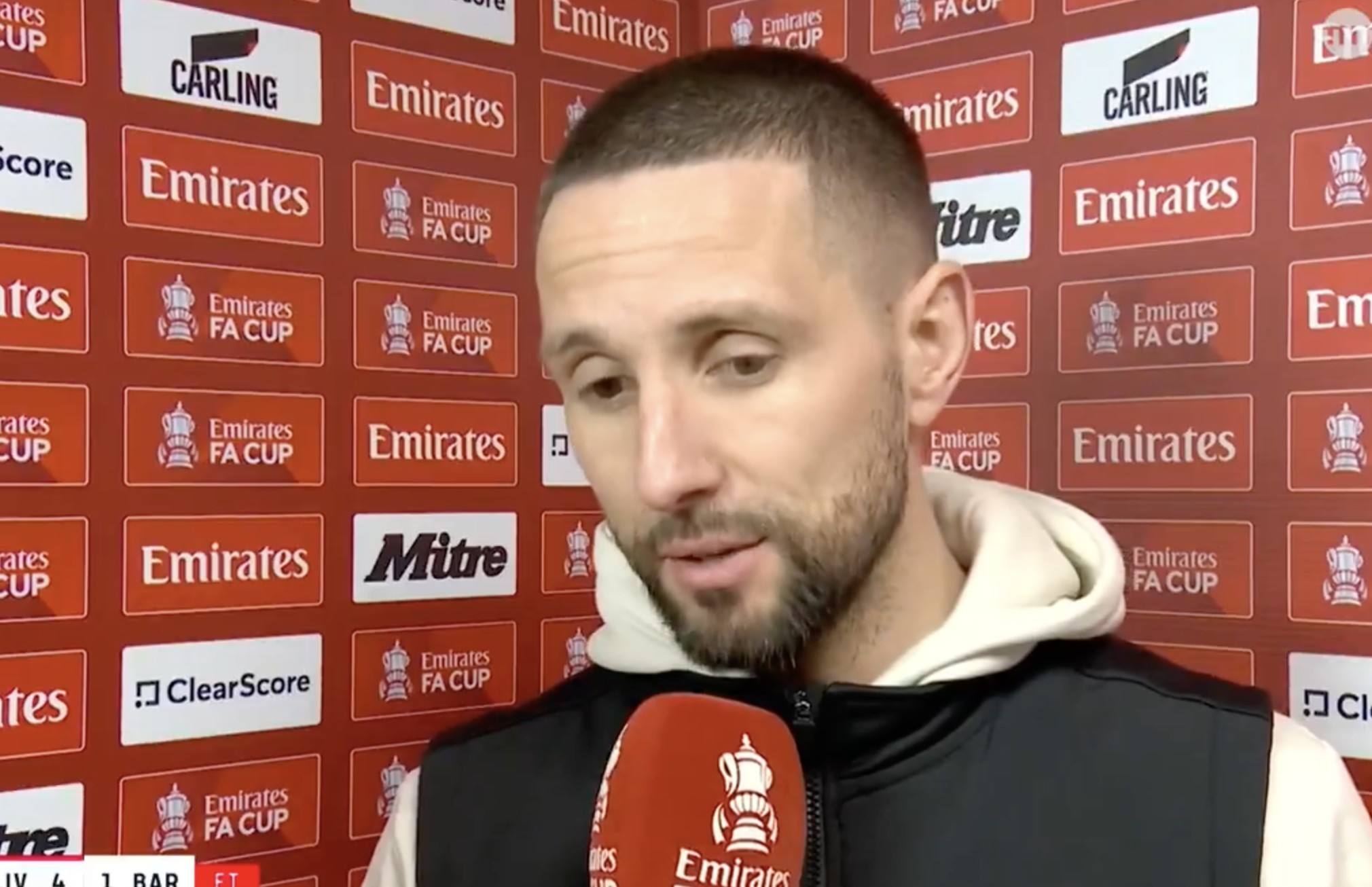 足总杯第三轮,巴恩斯利客场1-4不敌利物浦,赛后,巴恩斯利主帅霍里哈内接受了TNT体育的采访。康纳,我能感觉到你很失望,1-4,但你们今晚的表现非常出色,你应该为球队感到自豪。是的,我对小伙子们感到难以置信的自豪,我觉得他们表现非常出色,从第一分钟到最后一刻都坚持战术计划。比赛快结束时有点累,这是可以理解的,因为有时我们很久都没有控球,但我觉得我们开局非常好,坚持着1-2的比分,他们不断派上顶级球